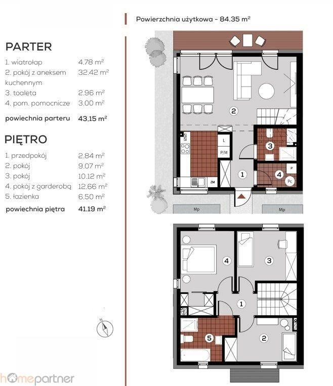 Parter: dobrze doświetlony salon z aneksem kuchennym, toaleta, wiatrołap z miejscem na zabudowę szaf, pomieszczenie pomocnicze